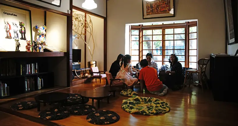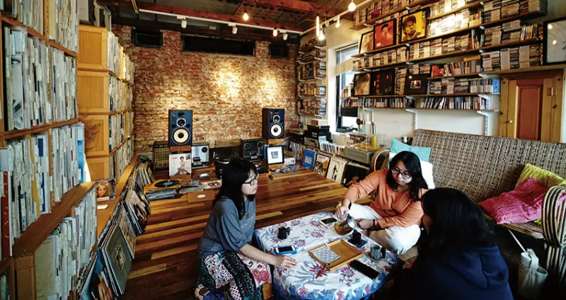 在客廳和我們聊著老屋生活記憶,一群友人早已遠道而來窩在黑膠房,自在放鬆聽音樂,就像他自己一點一滴完成老家整修時,那份心滿意足,一直在這裡。