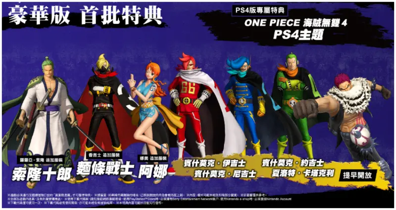 另如購入PS4/Nintendo Switch™繁體中文豪華版、限定版除了上述特典以外,還可加碼入手賓什莫克、伊吉士、賓什莫克、尼吉士、賓什莫克、約吉士及夏洛特、卡塔克利共4名角色的提早開放使用權。此外,PS4繁體中文豪華版、限定版將追加平台專屬特典《ONE PIECE 海賊無雙4》PS4主題下載代碼。![]()