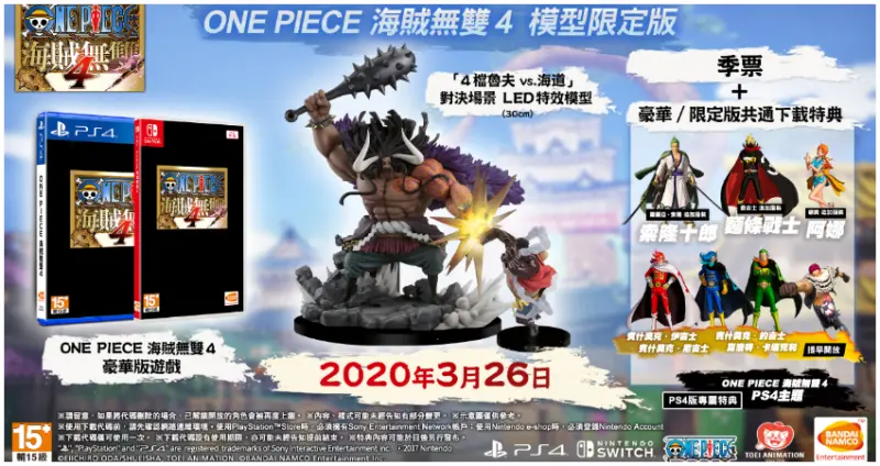 台灣萬代南夢宮娛樂宣布,「ONE PIECE」最新家用主機遊戲作品—PS4/Xbox One/Nintendo Switch™《ONE PIECE 海賊無雙4》繁體中文版預定將於2020年3月26日;STEAM版於2020年3月27日發售,並同步公開豪華版、限定版及首批特典收錄內容。此外,在最新公開的宣傳影片中,強者們將於和之國集結,4檔型態的魯夫「蛇人」和黏滯果實的能力者「卡塔克利」將爆發充滿魄力的激鬥,敬請欣賞。