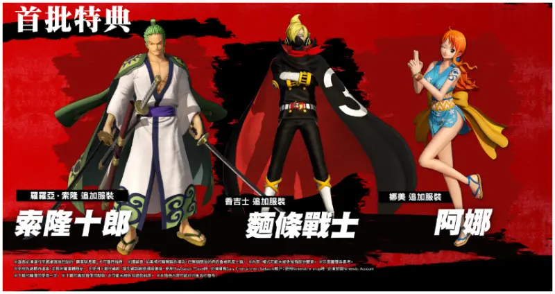 凡購入首批實體PS4/Nintendo Switch™《ONE PIECE 海賊無雙4》繁體中文版的玩家,將可獲得動畫「和之國」篇裡的角色造型服裝下載代碼: