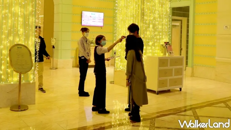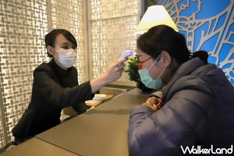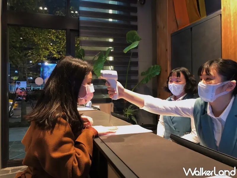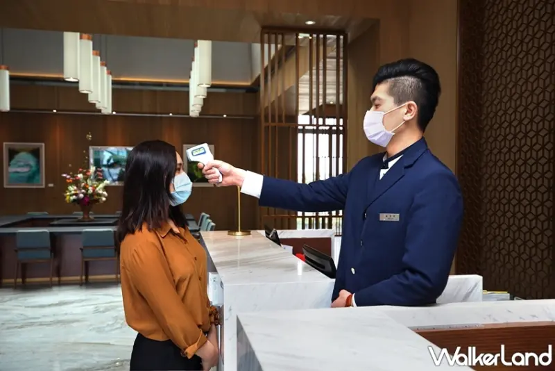 進入飯店客人均進行體溫量測及手部酒精消毒。
