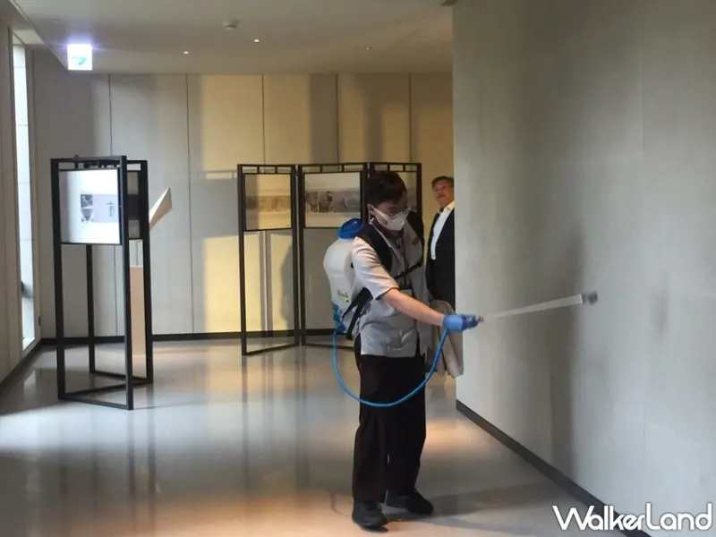 大門口,各餐廳出入口,均放置酒精消毒器,並加強飯店公共區域之消毒,尤其對水塔、空氣濾淨網、公廁及各公共區域加強清潔與酒精、漂白水消毒。