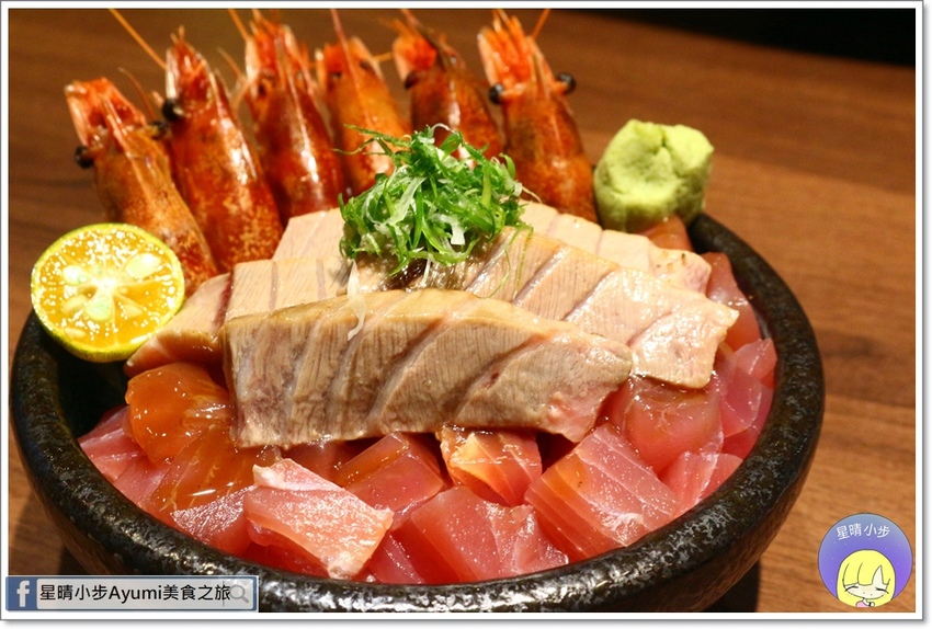 有六尾胭脂蝦,吃起來非常鮮甜一點腥味都沒有,大腹是黑鮪魚用火烤的方式來處理,吃起來真的很鮮嫩。底下是滿滿的鮪魚也就是俗稱的鐵火,加上一些配料就是散壽司的概念...<全文介紹>