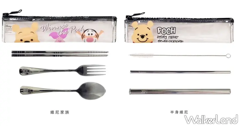 全台獨家上市的「維尼環保餐具組、吸管組」共推出三種外袋選擇,包含維尼大頭款、維尼半身款以及維尼家族款,每一款都搭配防水拉鍊、鍊頭,具備完好防水功能並防止髒污進入,透明的袋身除了裝餐具之外也能當成鉛筆盒、化妝包使用。