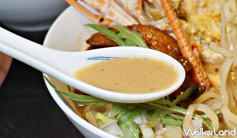 這次推出的聯名款「武x侍 龍蝦w拉麵」只在麵屋武藏神山店販售,以龍蝦頭熬煮的濃郁湯頭,配上豬骨、雞骨熬煮的湯頭打造經典、富有層次的濃厚雙湯頭W Souo,每一碗都會附上「黑醋角煮」以及「龍蝦雲丹燒」,麵體則是配上中粗捲麵,加上芝麻葉、洋蔥丁、蔥白片增添口味,整體搭配豐富。