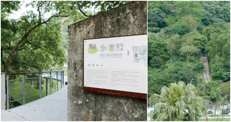 若是從美的世界社區(福德街51巷)方向下山,就會來到永春陂濕地公園。這座被四獸山環繞的凹地,清朝時期原為儲水陂塘,後來逐漸乾涸成為軍方用地,經多年閒置,在強調都市森林、綠地活化觀念下,將3棟舊營舍作為公園場館,引流豹山溪及無名溪,並規劃環形步道、雨水花園、高架棧道、蕨園和林園濕地等,成為全新的水棲動物的棲息地或庇護所,串聯四獸山步道系統,就是都市人周末最便利、最解壓的去處。