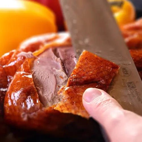 全新品牌「金牌長承烤鴨」緣起於主廚李哲松,透過20多年在知名飯店掌杓粵菜的經驗,選用2-3公斤的台灣花東番鴨,經過清洗、打氣、燙水、淋醋水、吹風等繁瑣的前置作業,再以粵式經典掛爐將鴨膛肚內填入天然藥材、辛香料,按照獨門比例醃製抹塗入味,費時一天一夜的時間打造,讓烤鴨達到皮脆肉滑,香嫩多汁的口感,出爐前再淋上熱油讓鴨皮染上金黃油亮的琥珀色,令人食指大動。