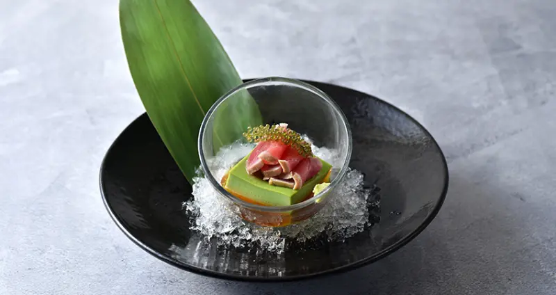 炎炎夏日食慾大減,是許多人想簡單輕食的季節,想吃得高級又想顧及「曲線」問題,這時候炙燒鮪魚翡翠玉子就是最清爽又兼具健康的選擇!將鮪魚先炙燒過,使用波菜製成清爽的玉子豆腐再配上海葡萄,展現夏日獨有的層次意境與清爽的日式風味。![]()