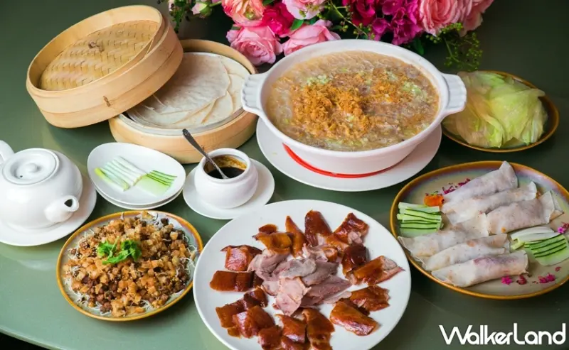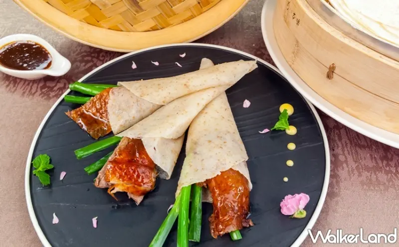 其中以饕客必嚐「片鴨黃瓜蔥捲餅」,嚴選宜蘭櫻桃鴨種,其製作工法繁複,以港式燒炙方法加上法式料理的香橙鴨做結合,使用君度橙酒淋上鴨的表皮,除了酒香,表皮更酥脆,肉質口感更是紮實有嚼勁,並搭配新鮮蔥段、小黃瓜及獨門特調的甜麵醬與全麥餅皮,讓美食完美演繹。