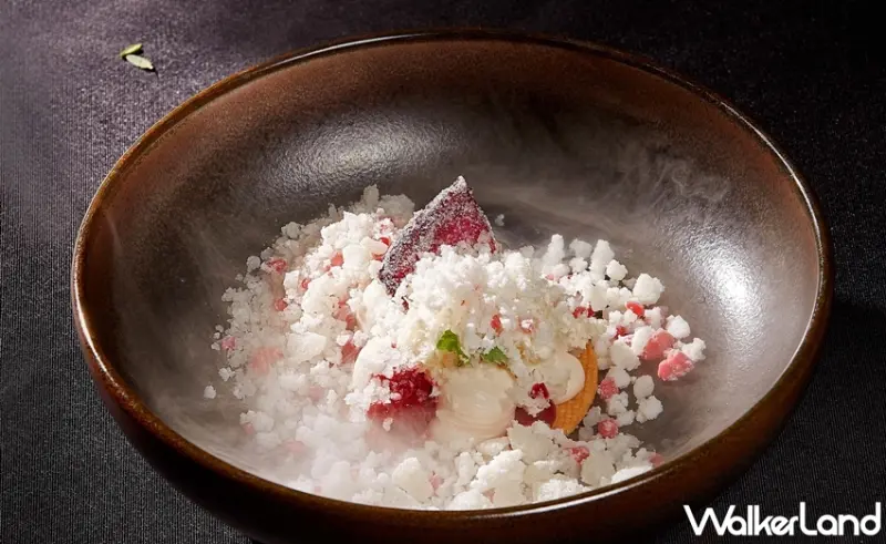 甜點則是主推「玫瑰荔枝覆盆子塔」以法國甜點大師Pierre Hermé 的代表作Ispahan為靈感,將優格蛋糕搭配覆盆子玫瑰奶醬,綴以如紅寶石般閃耀的覆盆子,上桌時現灑沁涼的液態氮荔枝冰沙,視覺和味覺體驗同樣消暑。