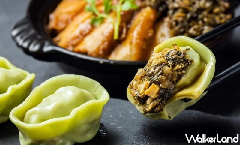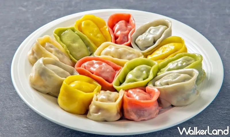 其中紅色的「剝皮辣椒雞肉餃」,主廚選用去骨雞腿肉、洗淨剁碎後拌入切碎的生香菇、宜蘭青蔥、麻油以及胡椒粉,接著加入來自花蓮的剝皮辣椒油以及剝皮辣椒碎拌勻成餡,最後再以加入紅麴粉的水餃皮悉心包裹而成。![]()
