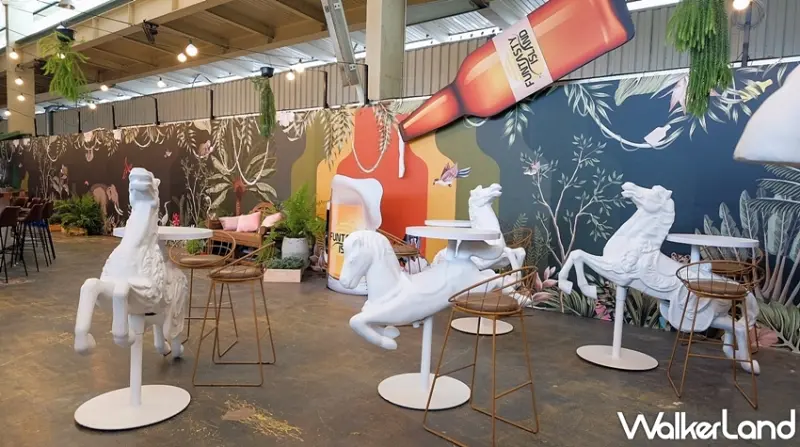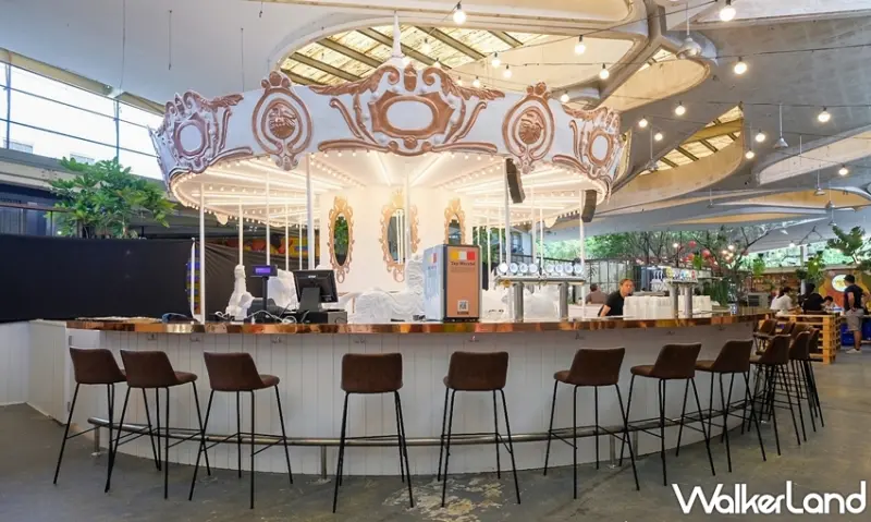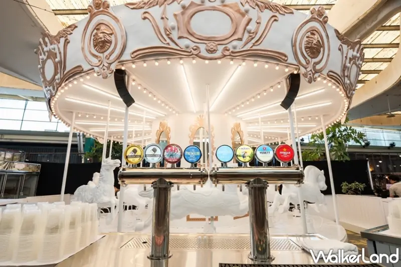 並且在裝璜上特別打造白色木馬造型立食桌、叢林背景前的白色鞦韆、翹翹板和巨型啤酒裝置物,希望可以讓每一位來到這邊暢飲的朋友們還可以拍一張讓人羨慕的網美照。此外,將充滿童趣的旋轉木馬華麗變身,幻化為絢麗迷人的環狀啤酒吧檯,二十四柱生啤酒柱由不同品牌輪番上陣,入口處的整排冷藏冰箱提供庫藏豐富的各國精選瓶裝、罐裝啤酒。
