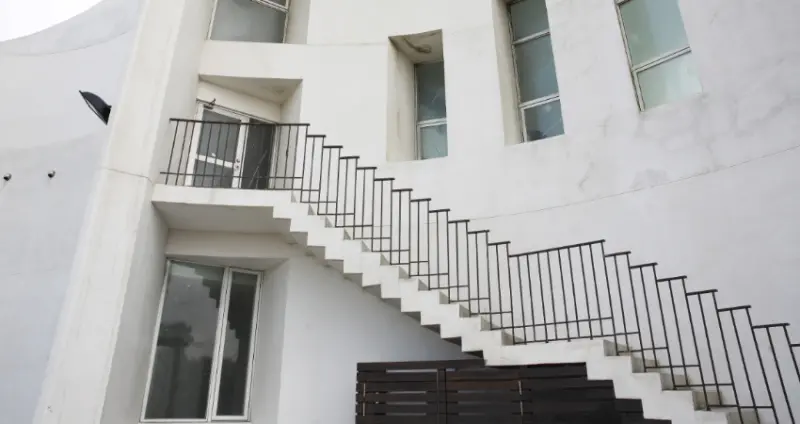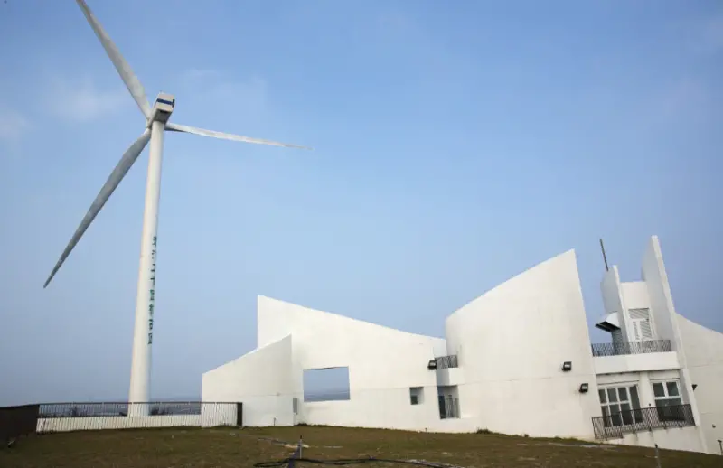 從遠方觀看,白色建築與四周的發電風車組成一幅美麗的照片,來到這裡,必拍的景點就是建築側面的弧形樓梯,任何角度都充滿意境,建築頂上的草坪與弧形牆面也是許多網美喜愛的打卡點角度喔!