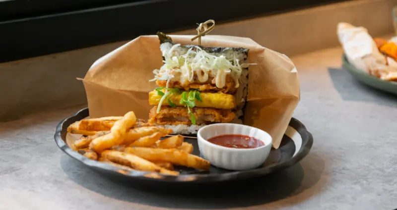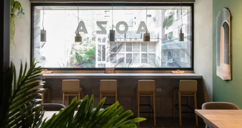 AOZA熬咋店主人張柏、小香以綠色作為主體色系貫穿空間設計,從牆面、植栽佈置到制服,皆選用深淺不一的綠色系堆疊出層次美感,這間店坐落於滿覆綠意、瀰漫愜意氛圍的范特喜文創聚落旁,讓用餐的客人能一同感受這份悠閒氣氛。店內餐點主打紙包料理、飯糰,紙包料理除了營造出驚喜包的感覺,還提供牛、豬、雞、魚、蝦與時蔬等多種台日韓風味;而飯糰除了霸氣份量,同樣給予多種口味選擇,滿足客人的味蕾需求。