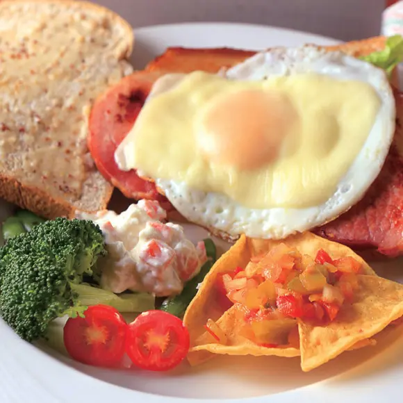曾在美式餐廳多年的主廚,迎合台灣人的口味創新作法,不但推出牛小排重量級早午餐,走改良版本的蛋捲更是下足重本,內層不走柔嫩口感,而是將蛋皮層層捲起,口感紮實、蛋香十足。麵包也是店家的強項,提供貝果、牛角、法國吐司、美式煎餅、烤吐司等選擇,十足豐盛。每到午茶時段,鬆餅是點單率第一名,將鬆餅作成小圓形狀,更能凸顯外酥內軟口感。