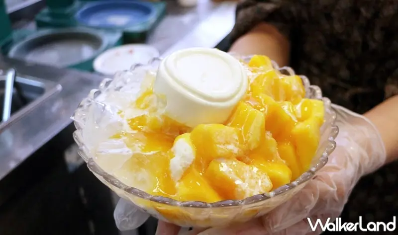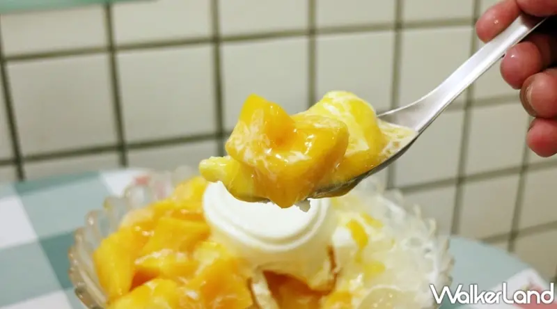 此外,「芒果海雁雪花」基底為輕柔牛奶雪花冰疊上滿滿玉井愛文芒果,佐上自製寒天凍與香氣芳郁的椰奶,冰頂放上一整顆用料實在的濃醇奶酪,芒果牛奶雪花暖黃清透在古典透明冰碗中更顯典雅。