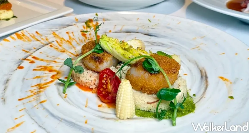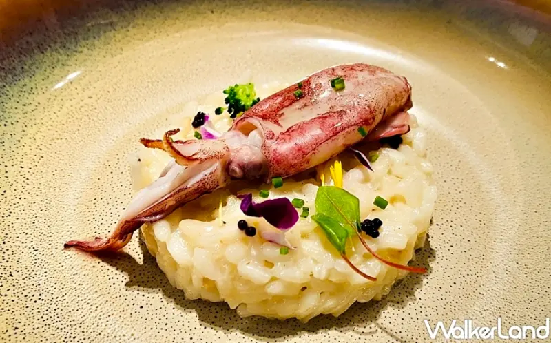 在全新菜單之中,推薦前菜「新鮮小透抽佐白松露小米」,主廚不吝成本使用珍貴的白松露調味,基底以奶油白醬與高湯的義大利米燉飯烹煮香氣四溢,佐上夏季盛產的澎湖透抽,風味濃郁卻同時帶有海鮮清爽層次。