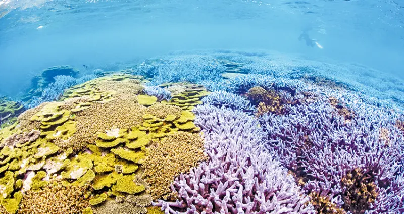 海域,紫色的中間軸孔珊瑚與翠綠的桌形軸孔珊瑚覆蓋率非常高,放眼望去整片海底就像是座大花園,