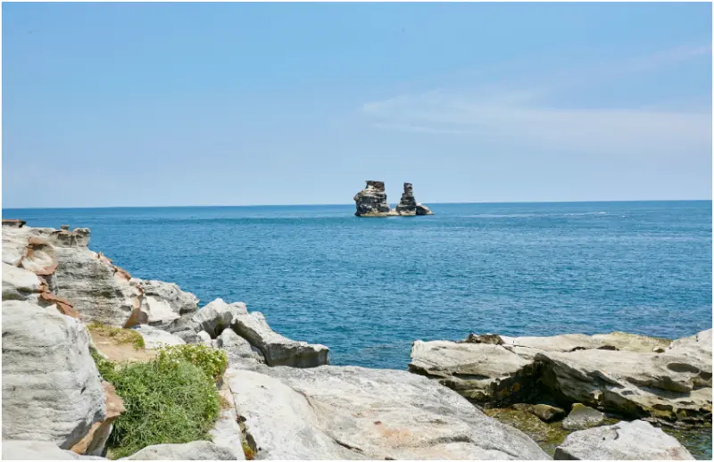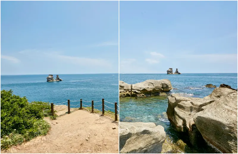 想近距離一窺燭臺雙嶼這個秘境景點,其實有兩條路線可以到達。一個是從獅頭山公園走上步道;另一個則是從水尾漁港內的金山水尾神秘海岸前往。其實兩種路線都需走上10-15分鐘,就看你喜歡走海線還是山線囉。