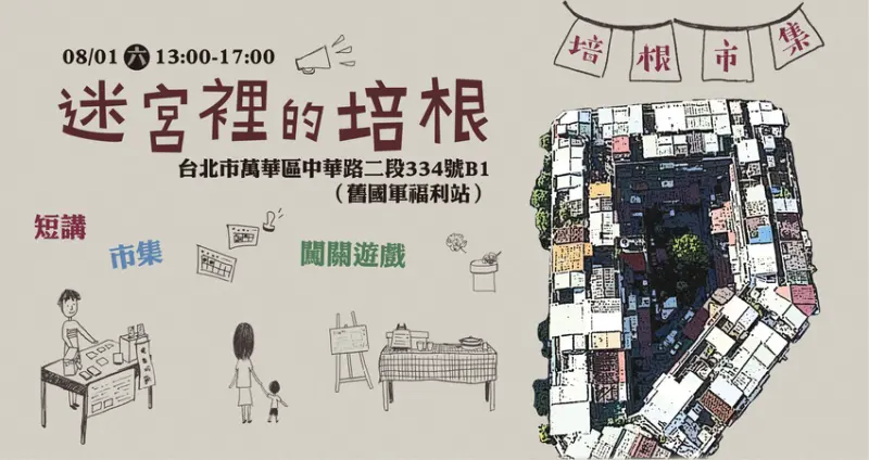 培根市集是台北萬華土生土長的市集,取「培力」、「草根」,由萬華地方社團、NGO、友善社區的公司等自力聯合發起。8月1日(週六)舉辦第十二屆的市集,時間是下午一點至五點,在南機場整宅二期舊國軍福利站(忠恕市場旁)。本屆主題是「迷宮裡的培根」,以南機場整宅日常生活動線中的迷宮特色為主,鼓勵民眾闖關遊戲「生存指南」,分享培根市集團體活力。![]()