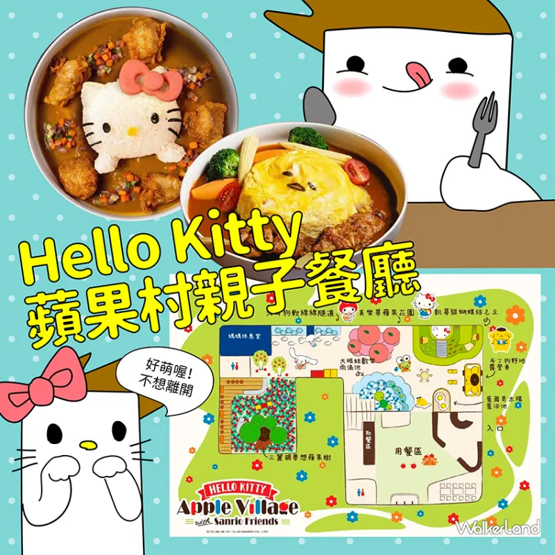 苗栗頭份開設全台首間「Hello Kitty蘋果村親子餐廳」,以草原野餐為主題,在200坪空間中打造6大主題夢幻樂園,打造一站式的吃喝玩樂,讓媽媽小孩進來之後就不想走。