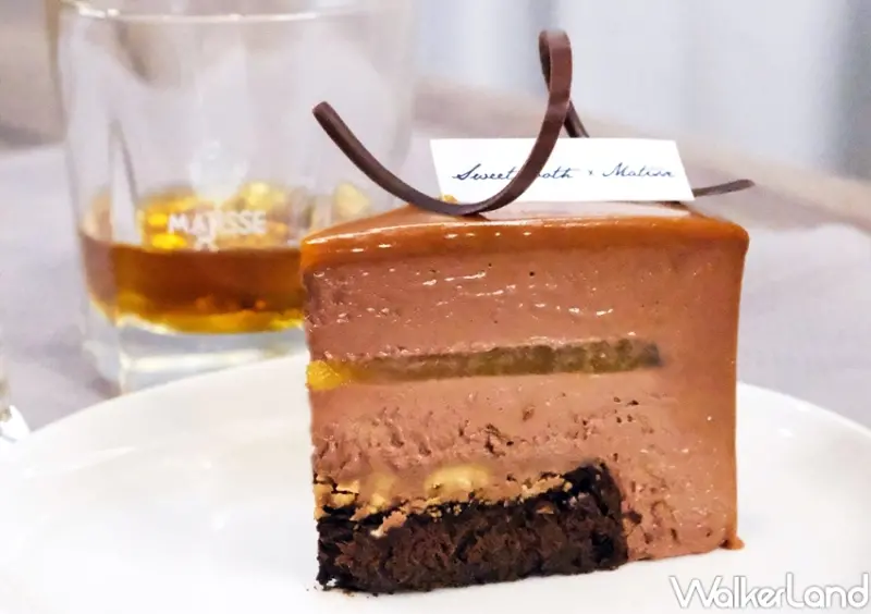而蛋糕的靈魂部分「威士忌蜂蜜巧克力慕斯」,使用香甜的蜂蜜增加威士忌的滑順口感,讓整體更加順口濃郁,同時凸顯馬諦氏19年原有酒體的香草蜂蜜甜味,不失酒香氣。