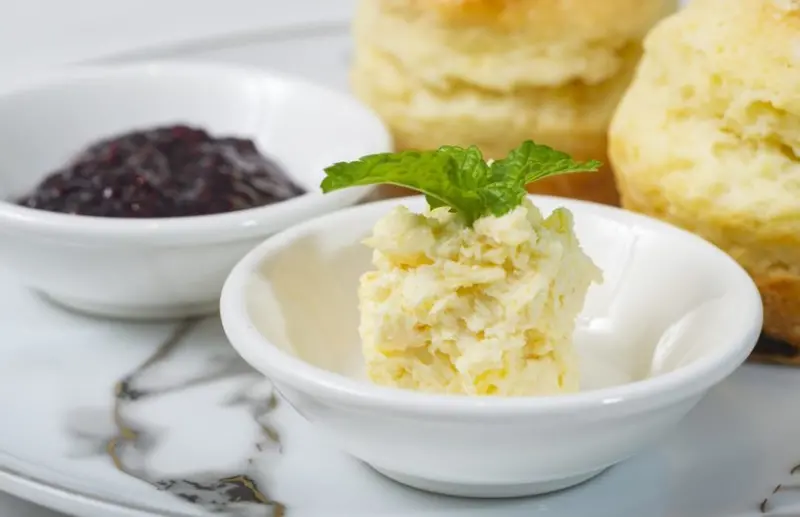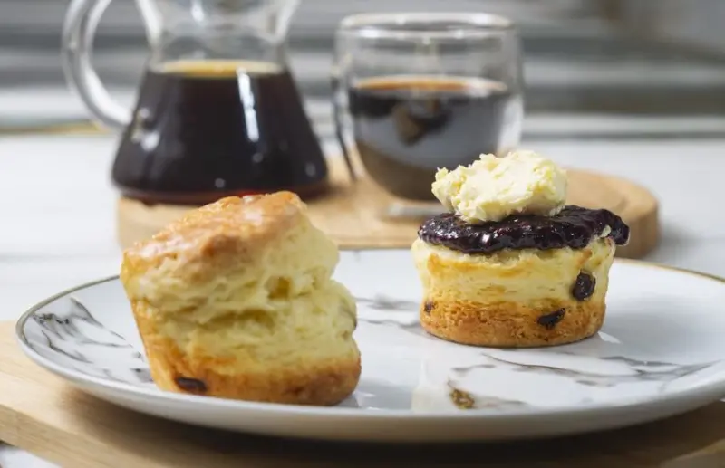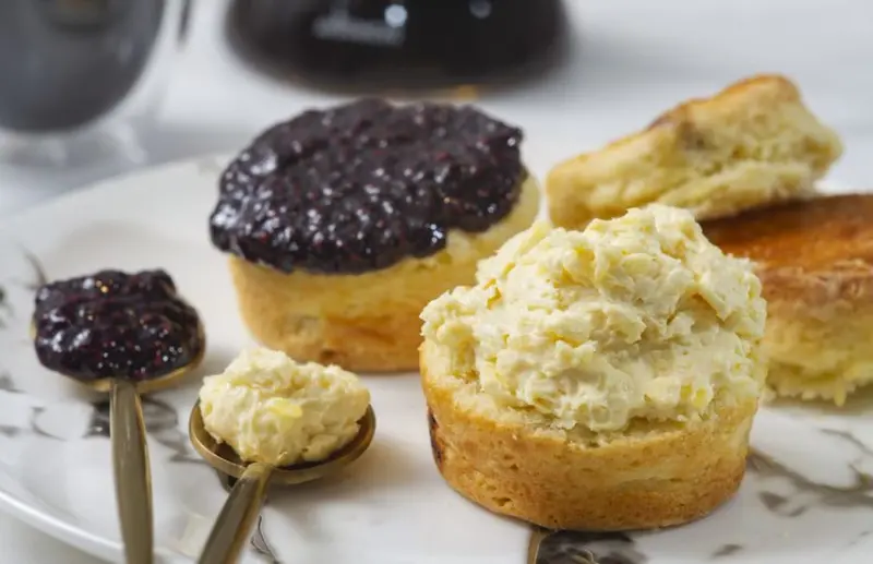 米食林 Ms.Lin Café獨家招牌英式司康,之所以會被封為台北最強司康,除了因為特殊配方調製的司康口感獨特且不乾澀外,每份英式司康套餐都還會搭配兩種醬料,其一是新鮮可口、不甜膩的「黑莓奇亞籽醬」,另一個則是那製作超費工、香氣濃郁的「德文郡奶油醬」,而這更是所有午茶控們來到米食林時必來朝聖的英式經典司康組合。