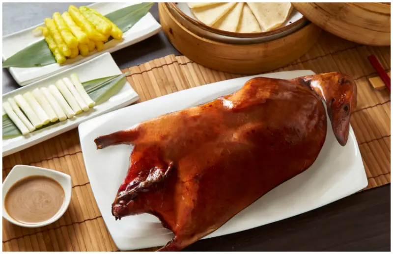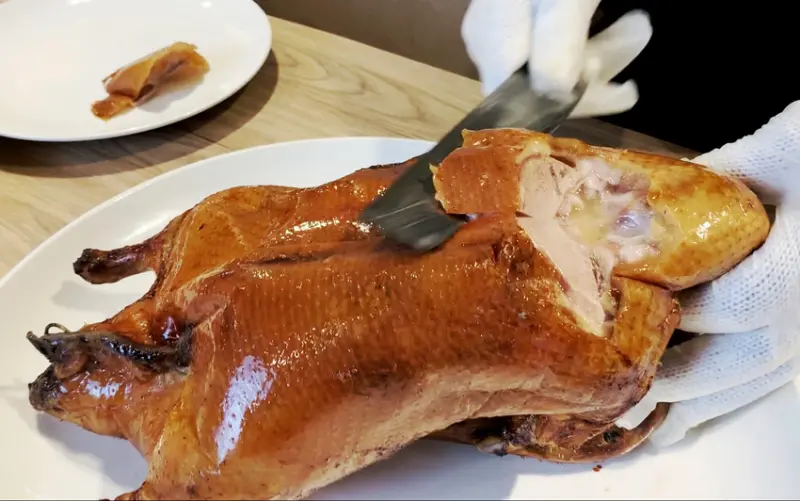 看看師傅在桌邊服務切片,這片鴨的色澤油亮多汁,更帶有淡淡小麥香甜的「小麥餅皮」,再抹上特製味增甜麵醬,搭配上新鮮、炸過的宜蘭三星蔥,一口吃下一場超多層次的味覺饗宴就在嘴裡上演!