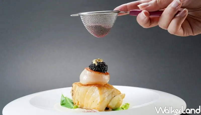 此外,另一道主菜「深海式羅西尼」靈感來自「伊人黎貝拉女性淡香精」系列那無所畏懼的花香木質調,以豐腴彈牙的深海齒魚挑戰傳統菲力組合,依序推疊北海道炙煎干貝與飽滿黝黑魚子醬,最後以金箔點綴,撒上主廚特製花茶粉末,華麗感十足。