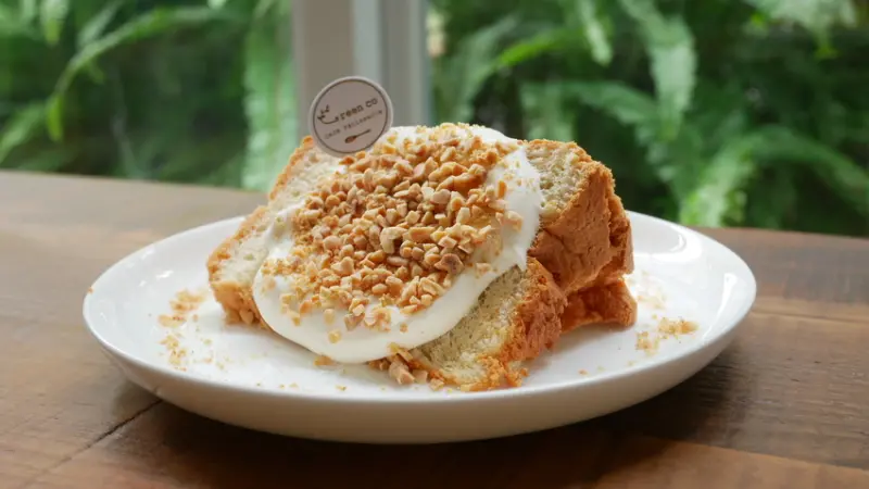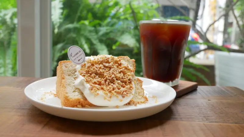來到這裡一定要點一下戚風蛋糕,融入在地知名的張豐盛花生,溼潤Q彈的戚風口感中伴隨著芝麻香氣,而爽口的法國鮮奶油更是畫龍點睛,來一趟綠沐恬拾,不得不承認桃園甜點真的很強大!![]()