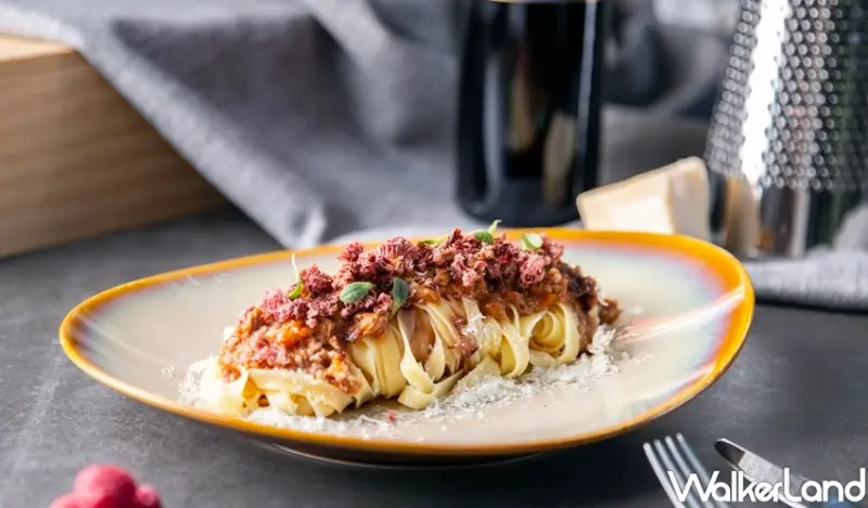 本次新菜單一定要品嚐的就是「義大利麵: 義式寬扁麵搭小牛膝、覆盆子及紅酒濃縮汁」,經典的米蘭式燉牛膝去骨,取骨髓及牛肉佐上濃縮紅酒醬汁製成肉醬,再灑上風乾覆盆莓。Chef Vito說尚未調味的義大利麵,本身就是「甜」的風味,用濃縮紅酒醬及覆盆莓粉的酸度中和出溫潤美味。