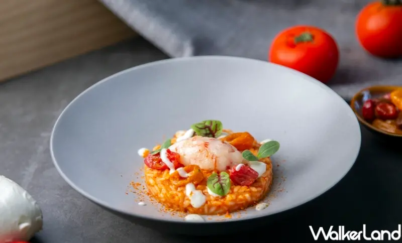 此外,燉飯: 義式燉飯搭彩色番茄、布拉塔乳酪醬汁及生蝦韃靼,三種番茄在此道料理中各有其妙用。牛番茄酸度偏高、聖女番茄偏甜、日曬番茄乾則自帶濃郁番茄香。三種番茄熬煮,搭配代表南義風情的北極生甜蝦及布拉塔起司醬汁,口感豐沛濃郁。