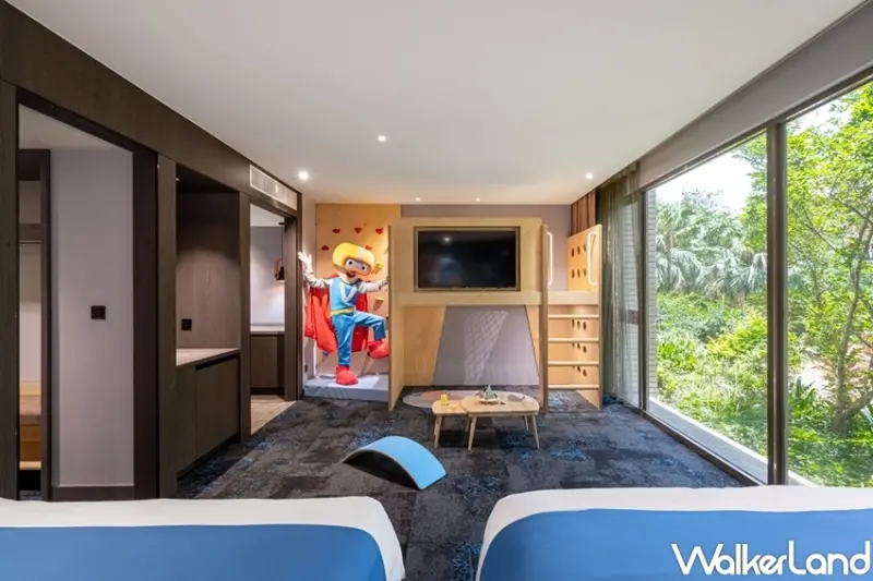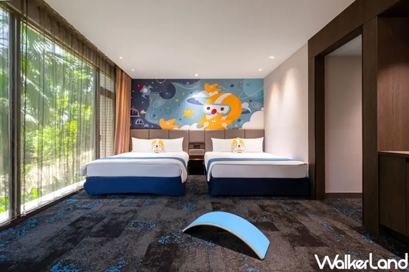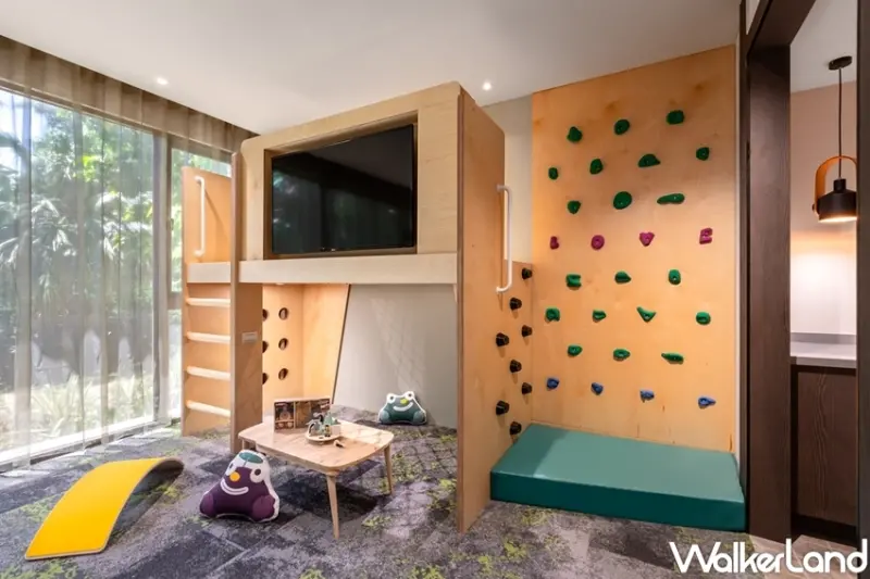 「地球尋寶主題房」整體設計則以溫暖療癒的故事與色彩作勾勒,推出獨家尋寶解謎繪本遊戲、童趣玩具服務、以及搭配房型獨有的溜滑梯/攀岩牆設施,讓父母與孩子於房內尋寶的過程中,互動及探索每個角落的小秘密。