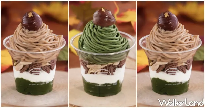 標榜使用京都宇治抹茶製作各式甜點的「一〇八抹茶茶廊」,這次研發秋季全新品項「蒙布朗聖代」,預計在9/7至11/15期間限定推出,特別選用帶有薄皮的澀皮栗子與法國品牌Corsiglia糖漬栗子醬搭配,製作成栗子蒙布朗擠花搭配抹茶,以最底層的抹茶果凍層層堆疊鮮奶油、巧克力脆片、熟杏仁條霜淇淋以及蒙布朗等配料,打造澎派吸睛的「蒙布朗聖代」,可以選擇抹茶蒙布朗口味或是栗子蒙布朗口味。