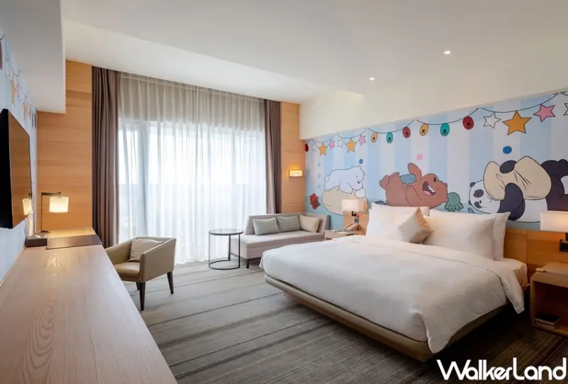HOTEL COZZI和逸飯店.台南西門館為了讓大、小朋友都可以體驗沉浸式卡通主題氛圍,全館從大門入口、餐廳到房間,各個角落都可以巧遇探險活寶、熊熊遇見你、飛天小女警等卡通頻道明星。並且現在入住卡通主題房,還可以享受晨光早餐及熊熊遇見你雙人午茶套餐,並且房間內的正版週邊12吋卡通布偶、牙刷造型盥洗包、購物袋通通可以帶回家。