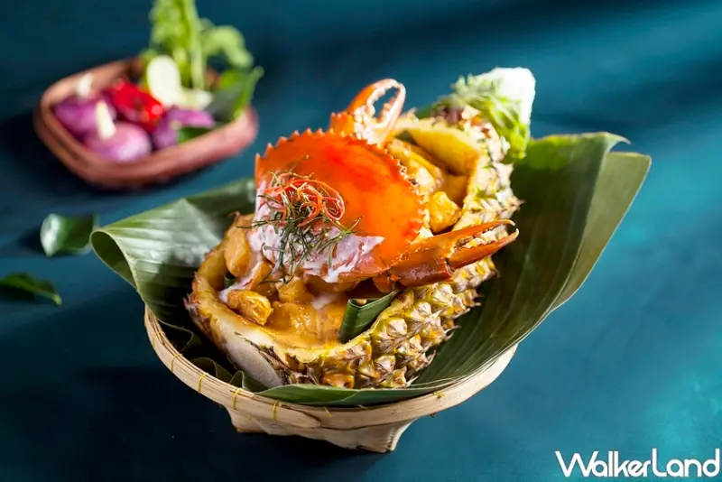 人氣推薦「鳳梨紅咖哩螃蟹」,以自製紅咖哩醬,將大量的蒜頭、辣椒、香茅、南薑、檸檬葉一同拌炒,加入泰國魚露及椰漿調和溫潤口感,此道料理結合傳統泰式元素與在地風味,金黃濃稠的紅咖哩醬汁滿佈豐腴蟹肉,香氣濃郁辛香不嗆喉,佐搭清新甘甜的鳳梨丁,不僅增添層次豐盈的口感,更堆疊出繽紛色彩的視覺震撼。