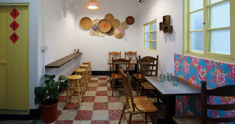 走進典型眷村小屋,店內擺設復古桌椅、老式腳踏縫紉機等,與牆上蒸籠、竹篩等客家元素混搭出懷舊風格。負責甜點的LuLu嚴選當季天然食材,主打千層蛋糕與塔類甜點;採用發酵奶油來製作,口感滑順不膩,並搭配減糖的健康新概念,美味不打折;而有著多年手搖飲經驗的Eddie,則負責研發各式搭配甜點的飲品;最特別的是客家擂茶口味的甜點與飲品,清爽的獨特滋味定要來嚐嚐。