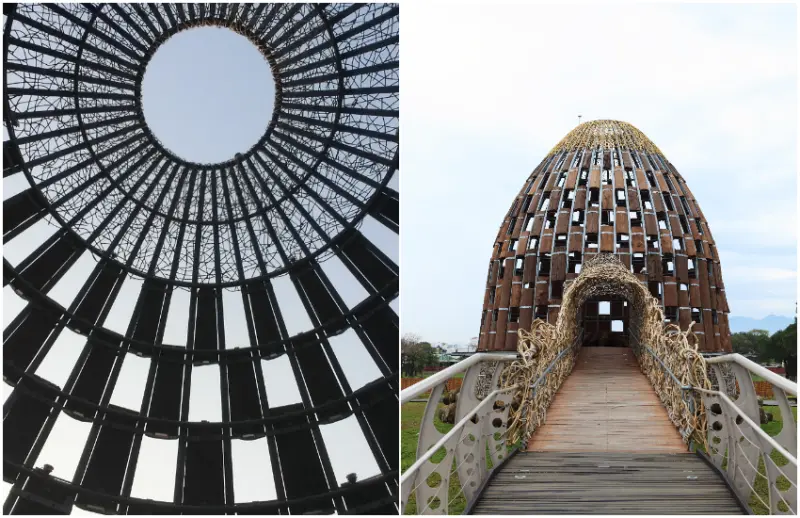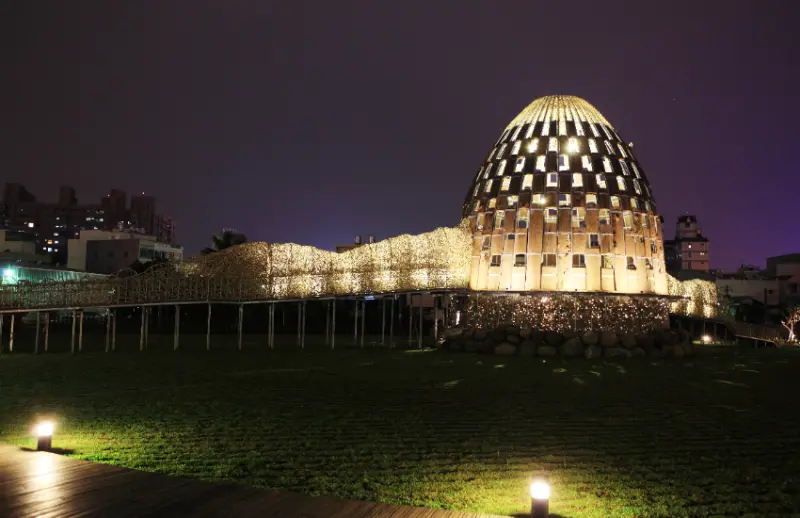 緊鄰縱貫鐵路旁的森林之歌,自建成開放以來,一直都是嘉義市林業廊帶中的地標,也是阿里山林業村藝術創作新景點。由藝術家王文志運用林務局提供之漂流木、廢棄阿里山鐵路鐵軌、黃藤及石頭等素材打造而成,銅材編織圓頂造型賦予破殼而出的新生和希望,以高聳神木及阿里山火車鐵軌為主題的設計意象,同時重現嘉義「木材之都」榮景。走進其間抬頭觀望,彷彿望見一輪明月高高掛,夜晚燈亮也將更加璀璨。