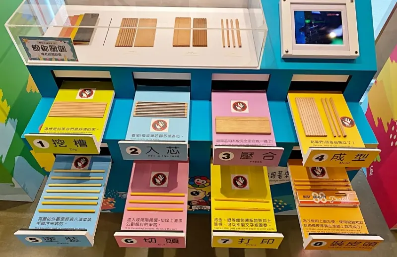 ▲鉛筆其實是從木板開始製作的!先將木板夾入筆心後黏合,再切割成一支支的鉛筆