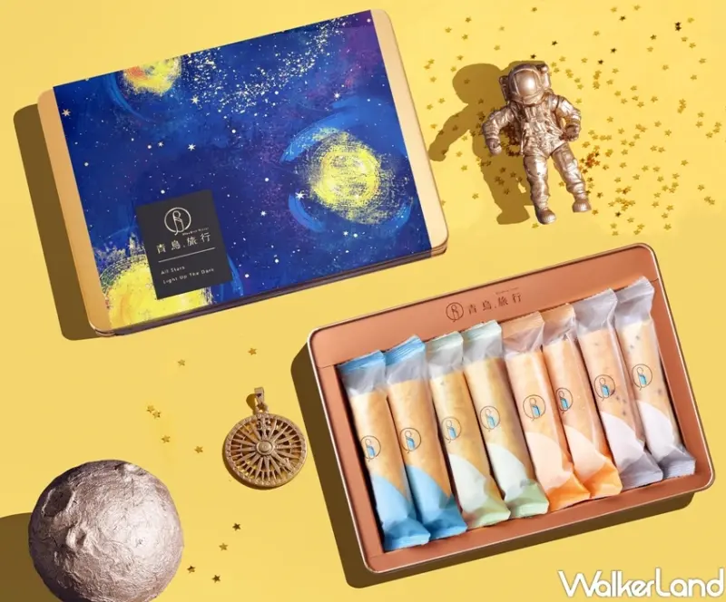 「夢谷韶光」爆餡蛋捲禮盒,以湛藍夜空為設計基底,夢幻的星空包裝,更貼近人們對月亮、天空的美麗想像!並用燙金手法呈現繁星閃爍的意象,期望每個在外打拼的人,都能讓這片星空點亮自己尋夢的眼眸,最適合給即將返家團聚的遊子,獻給家人一整片的星空,一起度過中秋佳節。