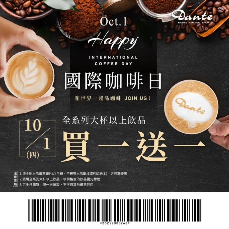 丹堤咖啡也同步歡慶國際咖啡日的到來,在10/1當日只要出示指定圖案,就可以享有全系列大杯以上飲品不限量「買一送一」的優惠,除了慶祝國際咖啡日,也同步對長期以來支持的咖啡控表示感謝與回饋。