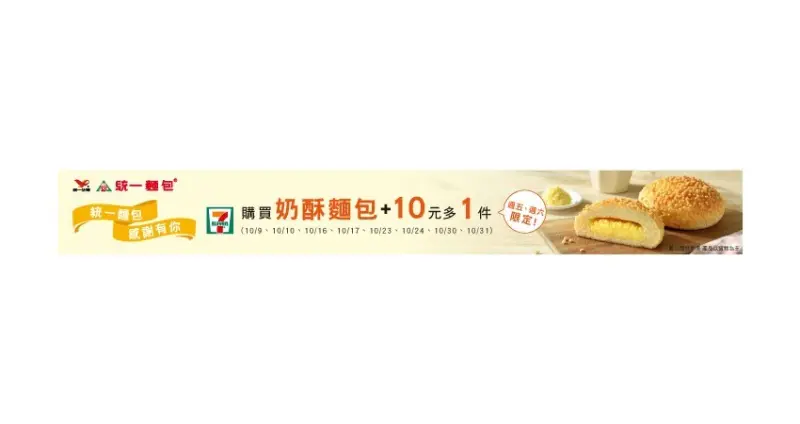 10/9-10/31期間 每週五、六,於7-11推出「統一麵包 感謝有你」活動,購買「統一麵包奶酥麵包」就能享有加10元多1件的優惠,活動為期四週,現在就到全臺7-ELEVEN,把經典美味帶回家吧!