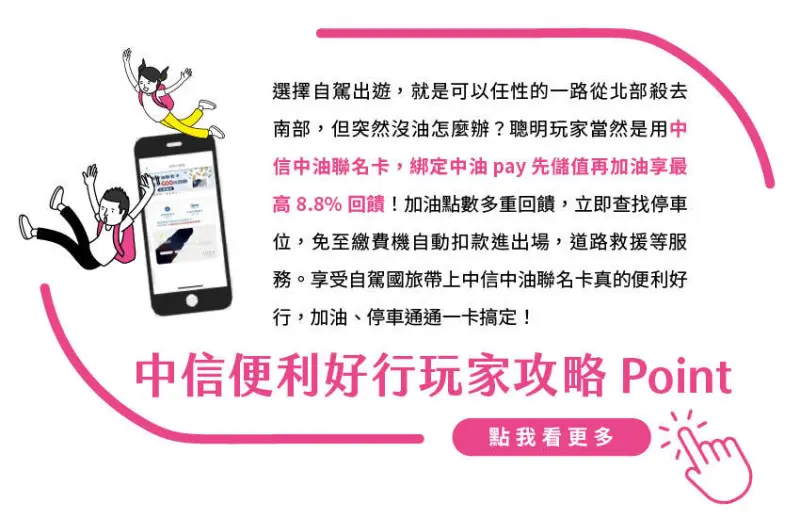 到外縣市旅行,帶上中信卡就能享免費市區停車最高2小時,多家指定合作停車場讓人停的好安心!選用中信中油聯名卡更聰明,綁定中油Pay先儲值再加油最高回饋可有8.8%(5%現金回饋+3%中油紅利+0.8%中信紅利)!