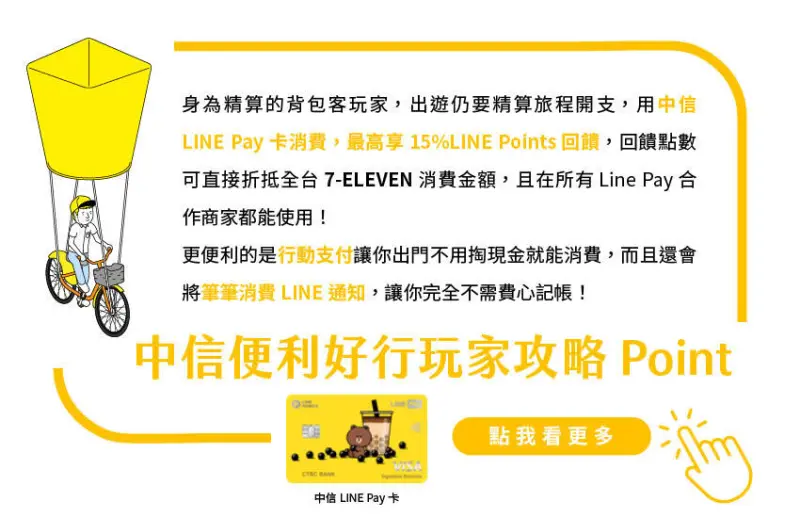 這次的旅程就想簡單背個背包輕鬆出發,什麼都可以不帶,只要有中信LINE Pay卡就夠啦!綁定手機以行動支付,連錢包都能不帶,超方便!