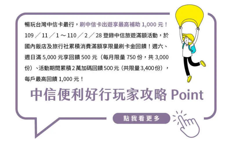 四條國旅路線是不是讓人看得很心動呢?別忘了10/31前刷中信卡出遊還有旅遊滿額贈的超值好康:訂國內飯店及旅行社累積消費滿額刷卡金回饋,每戶最高可回饋1,000元!跟上SuperWalker食旅大賞的腳步,帶上中信卡盡情玩樂國旅,所有旅途費心的瑣事就讓最貼心的國旅良伴中信卡來搞定,把握年底,趕緊把還沒用完的年假出清啦!