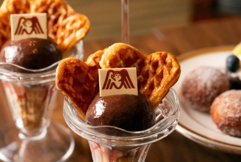 其中必吃甜點「森永巧克力冰淇淋襯鬆餅」,於復古聖代杯中鋪上榛果酥粒、草莓丁,再疊上以森永鬆餅粉烤成的美味鬆餅,還有以森永無糖可可及森永百分之六十可可製成的香濃巧克力冰淇淋。