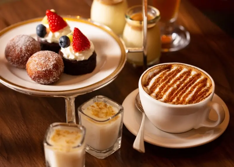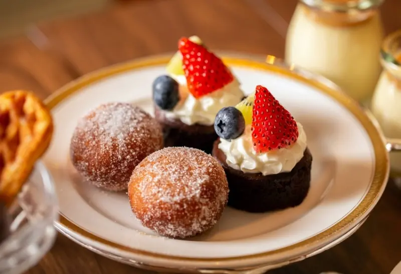 還有填入森永牛奶糖醬、卡士達醬「甜蜜雙餡」的金黃砂糖甜甜圈,以及以森永百分之六十可可製成的迷你巧克力蛋糕,綴上香濃鮮奶油、新鮮草莓、藍莓及奇異果丁,另外以森永甘酒粉及桂花醬製成桂花森永酒粕凍,呈獻淡雅花香交織酒香的迷人風韻,另外還有佐上森永牛奶糖醬的柔滑布丁,以及以森永百分之六十可可製成的香濃生巧克力等。