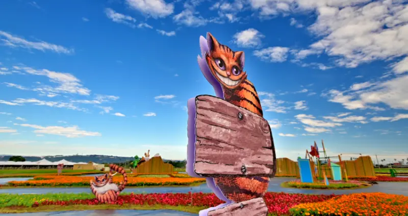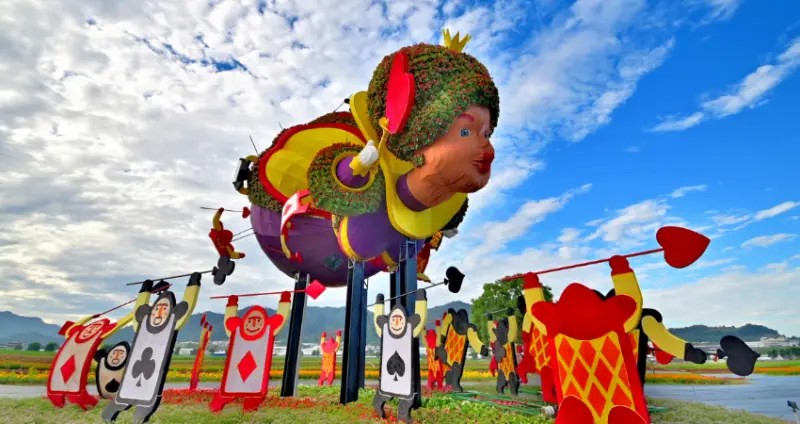 今年花毯節占地1.8公頃,使用近25萬株花草,10款花種如四季海棠、萬壽菊等組成立體花卉藝術裝置。主辦單位將《愛麗絲夢遊仙境》的情節立體化、動態化,用平易近人的花卉、巧妙的動線規劃,讓民眾透過「抉擇」選擇出屬於自己的參觀經驗。![]()