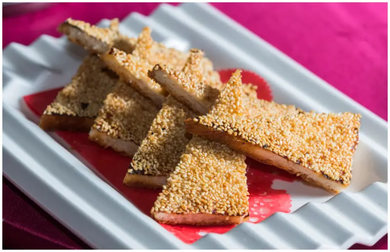 ▲「紅橋魚餅」是蒞臨磊園活魚餐廳的必點甜點,以鮮綿魚肉結合桔餅、冬瓜糖完美融合在土司上,並裹上香濃白芝麻,輕輕咬下一口,餅皮香氣與微甜滋味令人難以忘懷!