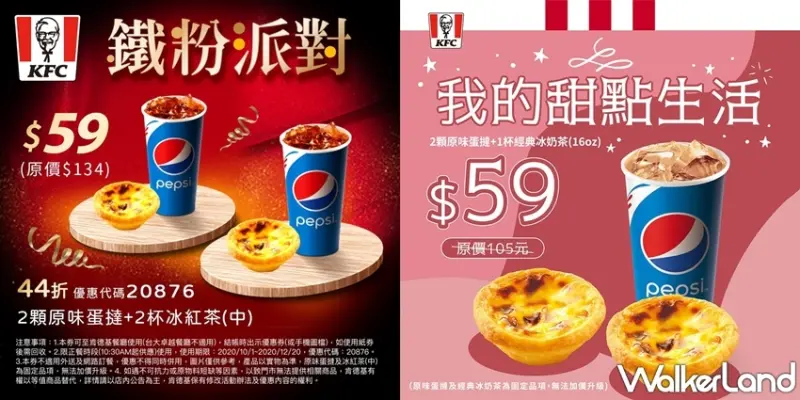 這次肯德基特別推出2款「隱藏版蛋撻套餐」,在點餐時輸入指定的優惠代碼並出示優惠券才能點購,其中「2顆原味蛋撻+2杯中冰紅」方案讓蛋撻控以59元銅板價品嘗到價值134元的雙人蛋撻套餐,另一款「2顆原味蛋撻+16oz經典冰奶茶」套餐則同樣以59元銅板價販售,能一次享用兩顆蛋撻並搭配高人氣的肯德基冰奶茶,堪稱是蛋撻控最完美的下午茶套餐選擇。